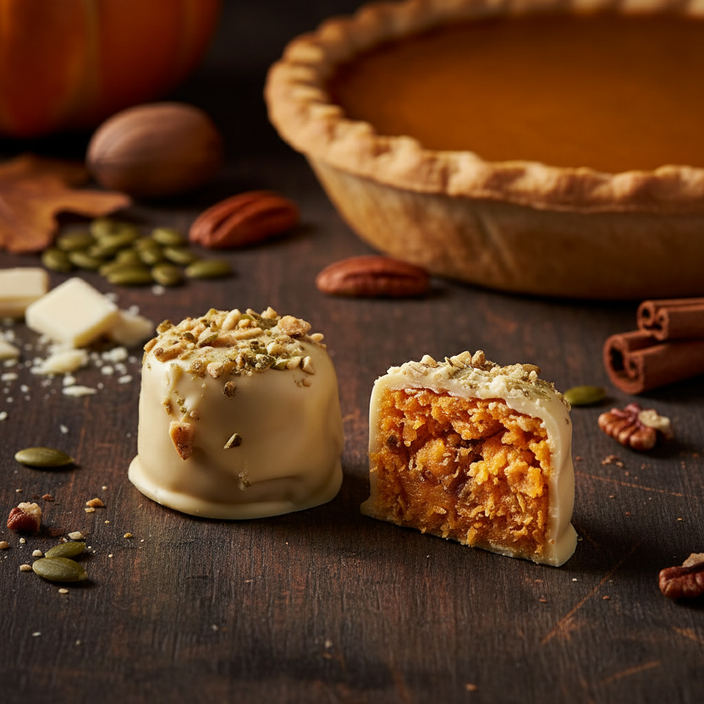 Pumpkin Pie: Covered in white Belgian chocolate and a sprinkle of toasted pumpkin seeds. Pumpkin Pie Macc style!
