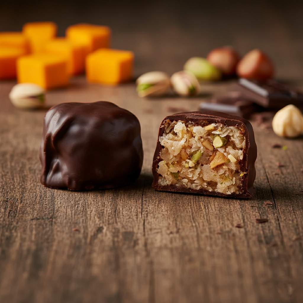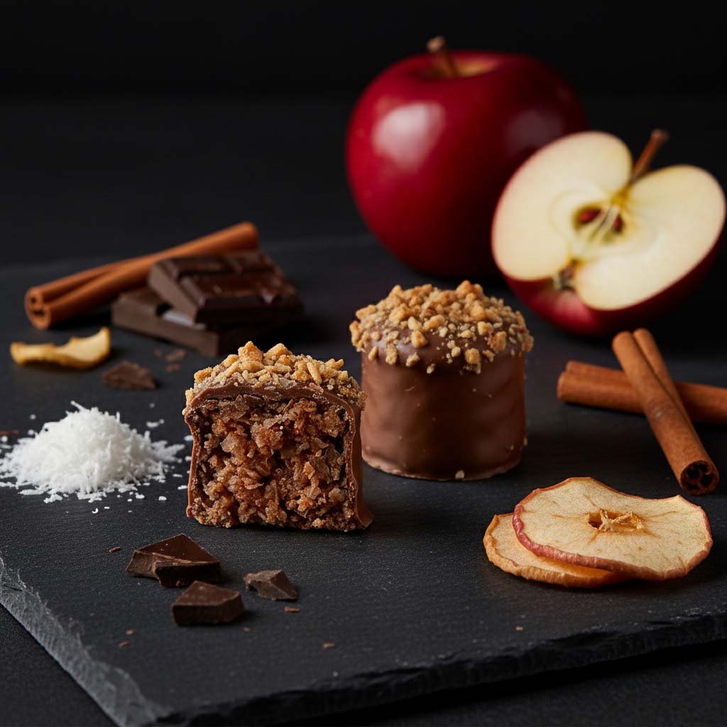 Apple Cinnamon: Covered in milk Belgian chocolate with dried apple pieces on top. A warm hug disguised as dessert.